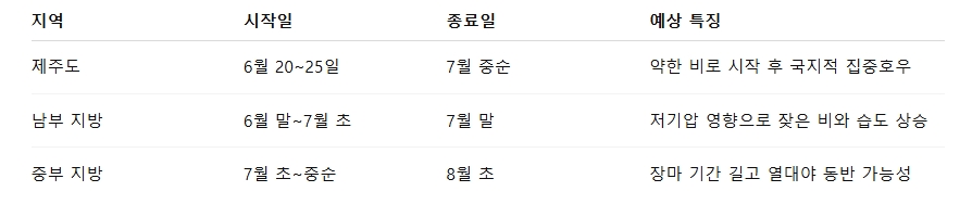 이러한 일정은 해마다 유동적이며, 특히 올해는 북태평양 고기압의 위치와 세력 변화, 그리고 중국 남부 지역의 저기압 활동이 영향을 미치고 있어, 장마 시기와 강수량이 지역별로 차이를 보일 전망입니다.