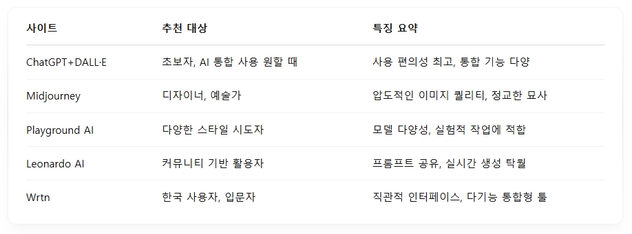결국 가장 중요한 건, '나에게 맞는 도구'를 찾는 거예요. 예술적 감성을 담고 싶다면 Midjourney, 다양한 스타일을 실험하고 싶다면 Playground AI, 가볍게 써보고 싶다면 Wrtn이 답이 될 수 있죠. 이 비교 글이 여러분의 선택에 큰 도움이 되었길 바라요.